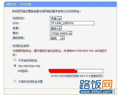 6、这一步进入到的是无线设置,我们可以看到信道、模式、安全选项、SSID等等,一般SSID就是一个名字,你可以随便填,然后模式大多用11bgn.无线安全选项我们要选择wpa-psk/wpa2-psk,这样安全,免得轻意让人家破解而蹭网。