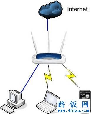 说明:无线路由器相当于一台有线路由器加一个无线发射的小型“基站”,可以同时满足有线电脑、无线的笔记本、手机等终端同时接入共享宽带上网。