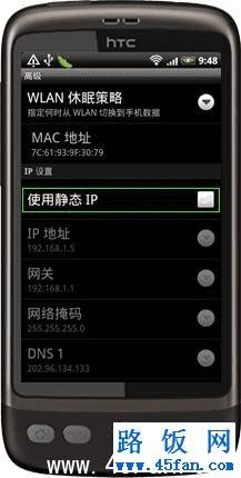 STEP2:手机默认“使用静态IP”的勾没有勾上,即自动获取IP地址(推荐)。获取到正确的网络参数之后,手机即可正常连接到网络。如果要手动设置静态IP,可以将“使用静态IP”勾选上,并手动设置“IP地址”、“网关”、“网络掩码”以及“DNS”等参数。