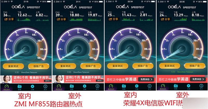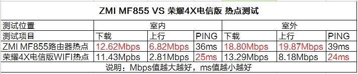 测试结果,ZMI MF855路由热点,在室内的下载和上传分别是12.62Mbps、6.82Mbps,PING延迟36ms;室外的下载和上传分别是18.80Mbps、19.87Mbps,PING延迟39ms。荣耀4X电信版Wi-Fi热点,室内的下载11.43Mbps,上传2.81Mbps,PING延迟25ms;室外的下载13.29Mbps,上传8.18Mbps,PING延迟24ms。