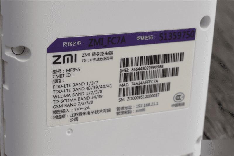 默认的网络名称:ZMI_FC7A(后面4位为MAC地址末尾4位),SSID密码为:51359750;网络名称和密码都可以登录ZMI MF855后台地址192.168.21.1修改,后台管理密码zimifi。很多小伙伴们关注的频段,全部印刷在了铭牌上,出国漫游前则可以找到对应国家的频段,看是否兼容。这里拿到的是工程样机,因此没有粘贴入网许可证。