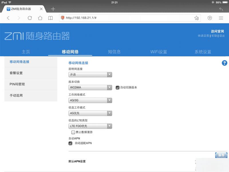 如果是台式机、笔记本可以在浏览器从192.168.21.1访问路由器后台,密码还是zimifi。