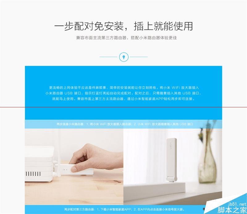 小米Wi-Fi放大器并非仅支持小米自家的路由器,同样兼容市面上绝大部分的路由器产品。不同的是,搭配小米路由器时,只需将小米Wi-Fi放大器插入路由器后面的USB接口上即可实现配对,而搭配其它路由器使用时候,需要进入小米智能家庭APP进行配置。