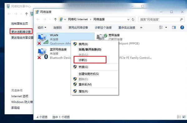 第二步、打开网络共享中心后,再点击左侧的“更改适配器设置”,之后会进入网络连接设置界面,然后找到“WLAN无线网络”,然后在其图标上鼠标右键,在弹出的菜单中,点击“诊断”,如下图。
