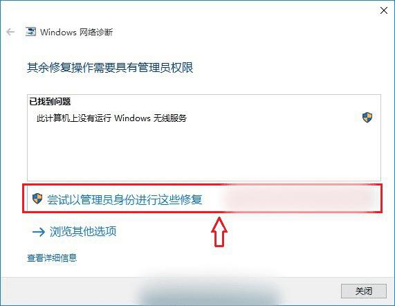 第三步、等待Windows网络诊断完成,之后就会看到诊断结果提示“此计算机上没有运行Windows无线服务”。这里点击“尝试以管理员身份进行这些修复”操作,如图。