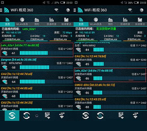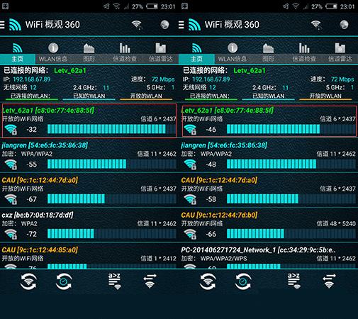 在接下来的信号检测方面,我们将会借助于常用的《WiFi概观360》软件来进行测试,路由器的信号为默认的“强”,数据仅供参考。