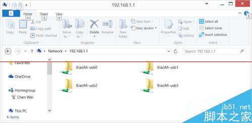 6、本例中路由器的地址是:192.168.1.1。在Window下可以看到4个共享分区。我们会挂载XiaoMi-usb1去我们的赚钱宝。