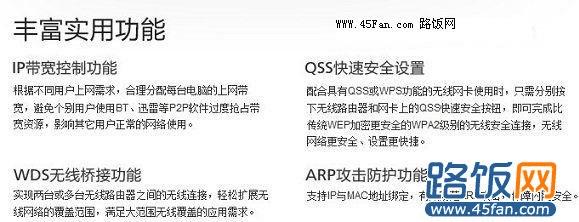 目前比较好的无线路由器都带有IP宽带控制、WDS无线桥接、QSS快速安全设置以及ARP攻击防护等高级功能。其中我们比较常用的是路由器IP宽带控制,该功能可以帮助我们更好的合理分配网络,保证每一个上网用户都可以合理的分配到网络资源。避免个别用户使用BT、迅雷等P2P软件过度抢占带宽资源,影响其它用户正常的网络使用。