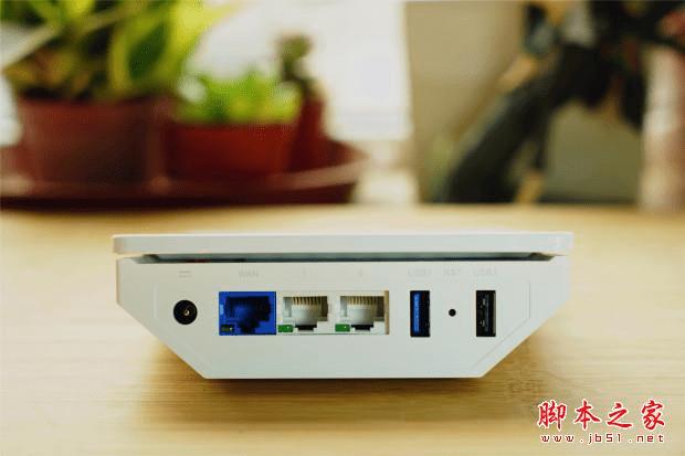 接口方面,新路由2 提供了一个WAN口、两个LAN,两个USB 2.0接口和一个电源接口。两个USB接口最大支持共12T的扩展。复位键被放置在两个USB接口的中间,长按五秒可以恢复出厂设置。
