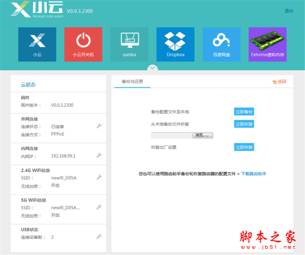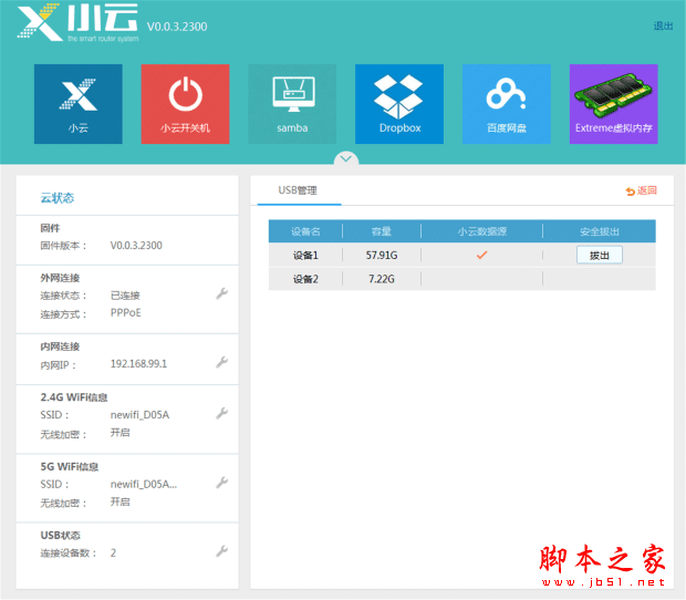 再来看看其他的功能。对USB设备的管理在“云状态”中,右边显示了USB上的设备(我当时只插了一个U盘)和TF卡,可以在这里点击拔出。
