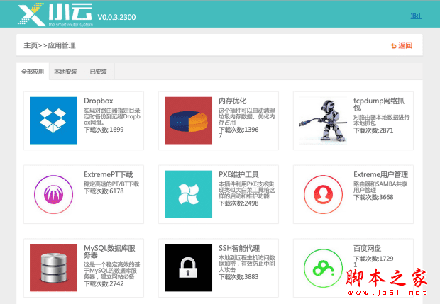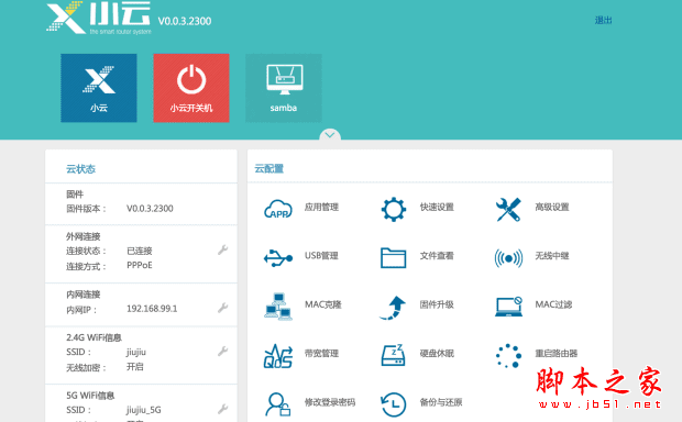 新路由采用的是小云OS,公测版本的固件(v0.03.2300)。整个界面的配色较为清新,上面绿色底栏的部分放置的是已安装的插件的图标,左边显示的是路由器的状态。右边是路由器的一些设置和基本功能,对路由器的管理主要都是在这一部分。