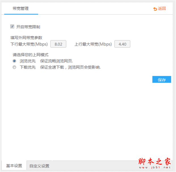 基本设置中可以调整带宽、选择上网模式,自定义设置则是可以设定某一IP的带宽。