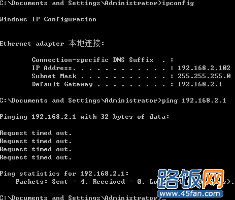 小编家的网络环境很简单,无线路由器上级连接有线路由器,有线路由器的网关是192.168.1.1,能ping通。无线路由器的网关是192.168.2.1却不能ping通,如下图所示: