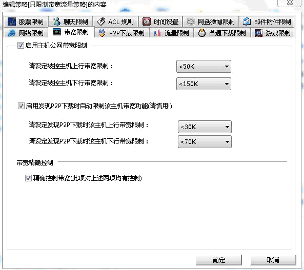 此外,你也可以通过聚生网管系统限制电脑下载速度而不是完全禁止局域网下载,设置也比较简单,点击“带宽限制”,然后这里可以分别设置上行带宽限制和下行带宽限制,并且可以在发现P2P下载时限制其网速,从而可以实现精准的、灵活的网络带宽限制,如下图所示: