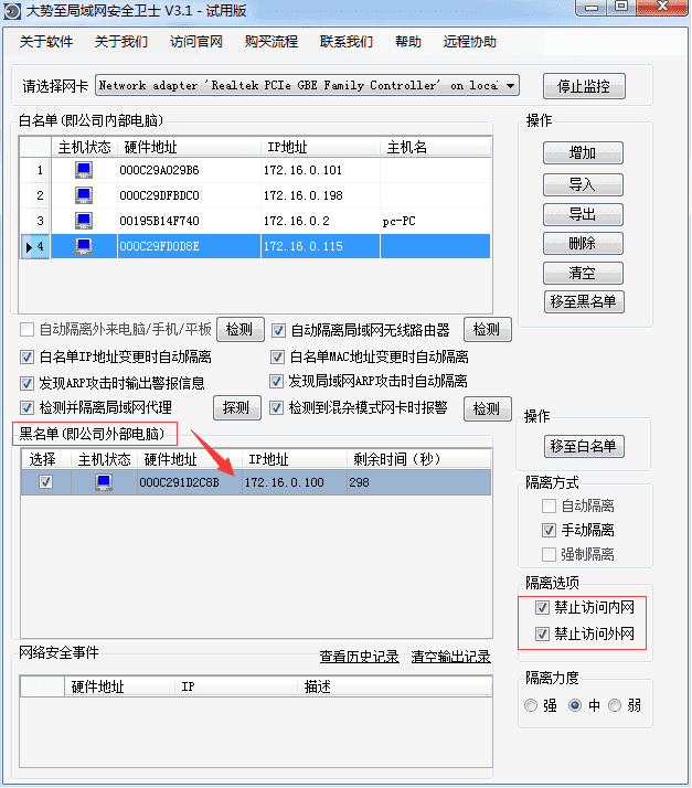 目前国内有很多专门的局域网网络准入控制系统,可以阻止某些电脑接入局域网,也就是阻止使用共同的路由器上网。例如有一款“大势至网络准入控制系统”(下载地址:http://www.grabsun.com/wailaidiannaokongzhi.html),只需要在公司局域网一台电脑部署,然后就可以实时监测接入到局域网的电脑、手机或平板,然后通过将其加入到黑名单,即可阻止其访问局域网其他电脑或服务器,并可以阻止其访问外网,也即实现了禁止其蹭网的功能。如下图所示: