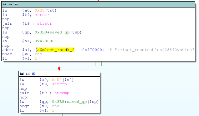 这个操作是将http_request_t结构体中偏移量0xD0的字符串指针和字符串“xmlset_roodkcableoj28840ybtide”比较,如果字符匹配,就会跳过check_login函数,alpha_auth_check操作返回1(认证通过)。