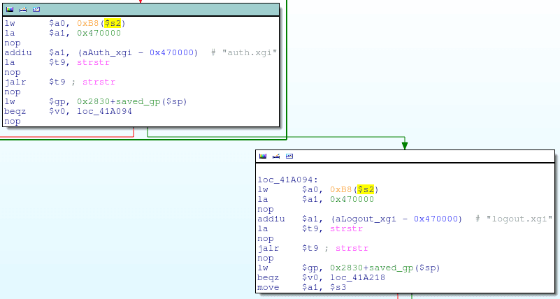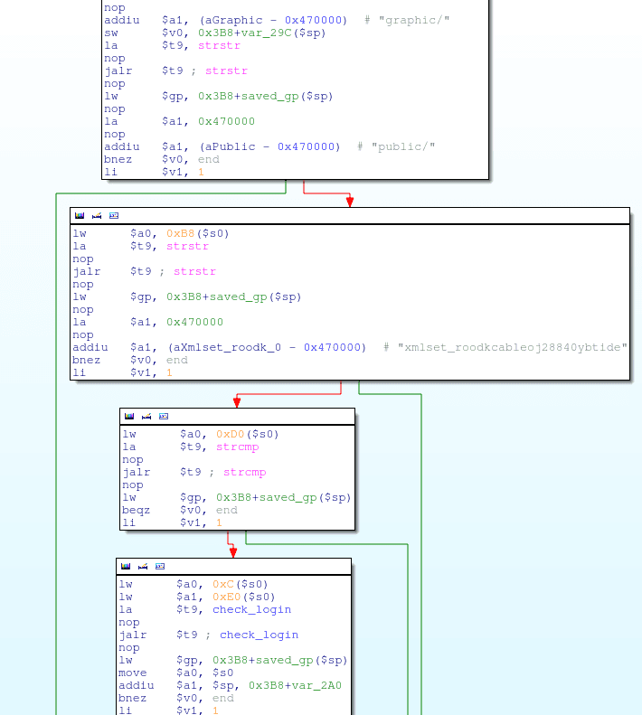 这些字符串比较过程看起来非常有趣。它们提取请求的URL地址(在http_request_t数据结构体的偏移量0xB8处),检查它们是否含有字符串“graphic/” 或 “public/”。这些都是位于路由器的Web目录下的公开子目录,如果请求地址包含这样的字符串,这些请求就可以不经身份认证就能执行。