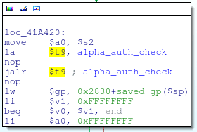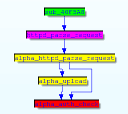 我们可以看到alpha_auth_check函数接收一个参数(是存放在寄存器$s2里);如果alpha_auth_check返回-1(0xFFFFFFFF),程序将会跳到alpha_httpd_parse_request的结尾处,否则,它将继续处理请求。