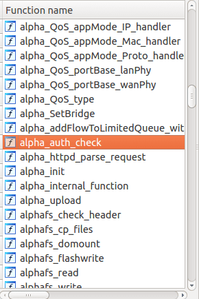 基于上面的字符信息可以看出,这个/bin/webs二进制程序是一个修改版的thttpd,提供路由器管理员界面操作功能。看起来是经过了台湾明泰科技(D-Link的一个子公司)的修改。他们甚至很有心计的将他们很多自定义的函数名都辅以“alpha”前缀: