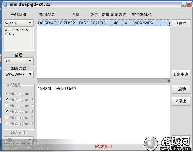 5、怎么样?嘿嘿,看到了吧?软件已经搜索到了wpa2加密的方式的路由器!当然了,软件的搜索方式是一起搜索,也就是wep,wpa2一起搜索,看看软件左边栏的“加密方式”你选择wep就会显示wep方式加密的路由,你选择wpa2就会显示wpa2方式加密的路由,咱们这儿讲的是破解wpa2加密方式的路由!所以wep一笔带过!如果是破解wep的路由,直接右边栏的“启动”按钮,剩下的几乎不用动手自动搜索密码(前提是有数据包哦!)