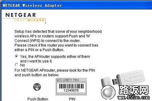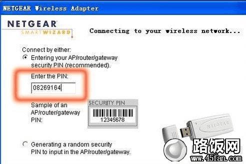 之后会会弹出如下图样的NETGEAR WN111无线网卡加密方式。NETGEAR WN111有两种加密方式:PIN加密和按键加密。我们先来讲讲PIN加密法,如下图。