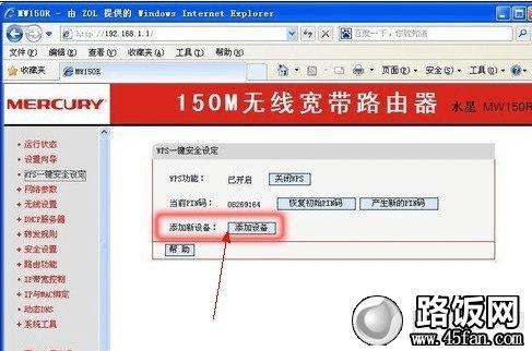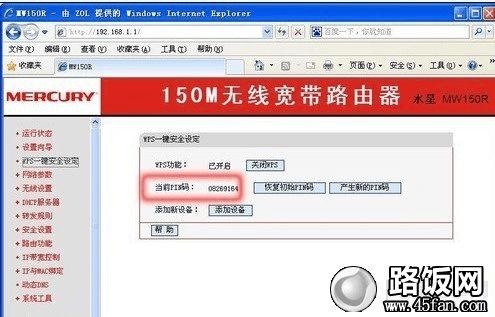 下面笔者以一实际无线路由器设置为大家通俗的讲解下,本文以水星Mercury MW150R无线路由器为例,首先安装好无线路由器,之后在IE浏览器地址栏中键入“192.168.1.1”,弹出用户名和密码对话框,水星的用户名和密码均为admin,键入后就会弹出无线路由器的配置界面。点击“WPS一键安全设定”,即可获取到它的PIN码信息:08269164(如下图)大家可以先用笔记下来,等下连接上网设备要用到,当然用到了再进路由器查看也可。