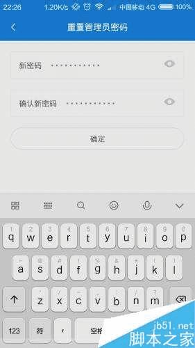 这样,在不需要输入原先管理员登录密码的情况下,我们就可以重新设置一个新的密码。我们在该页面中输入两次新的管理员登录密码,并点击确定按钮。
