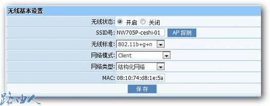 二、点击AP探测,弹出NW705可探测到的所有无线信号,此时选择所需要连接的无线路由器,保存。