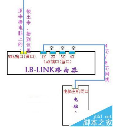 3).再准备另1条网线,一头接在路由器的蓝色口(LAN口)上,另一头接在电脑上;