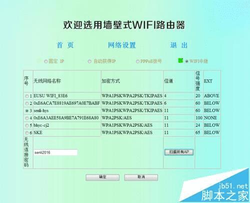 5、如果设置中继功能选择“WIFI中继”然后点击“扫描所有AP”选择所要中继的网线网络名称,输入无线连接密码,按“确定”后重启路由器即可