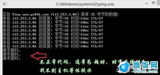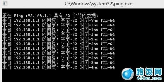这里检测是我们电脑是否可以访问www.45fan.com网站,如果会出现超时或者断断续续的连接、找不到主机等提示,那么很可能是路由器坏了。