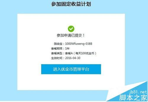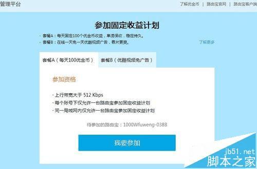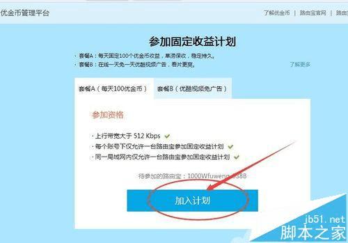 3、优酷路由宝会自动检测你是否达到了参加固定收益计划的最低条件,如果都符合条件,那么点击下方的“加入计划”命令按钮吧,如下图所示