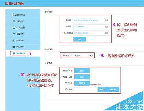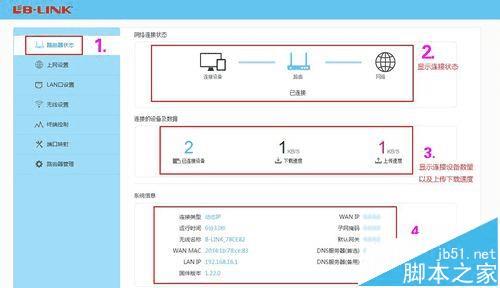 2)进行网络上网设置(注:没标“红框”的地方不用改),路由器状态是显示当前网络连接状态的,包括有多少台设备连接。
