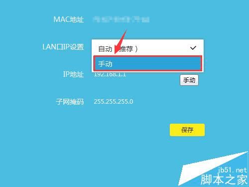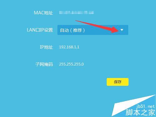 4、路由器管理IP地址默认为自动设置,在没有冲突的情况下为默认的192.168.1.1,更改IP地址点击右边的下拉菜单