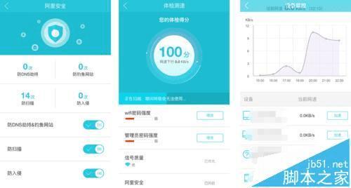 5、选择阿里安全,各种网盾保护,随时保护你的网络安全。选择体检测速,直接看分数最直观。选择设备监控,能够看到曲线图,可以直观的看到每台设备的网速情况。