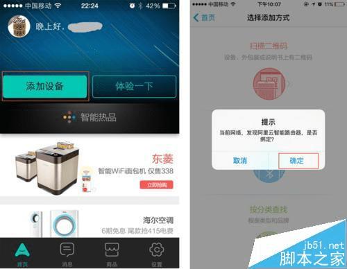 2、必联这款BL-AC886M智能路由器手机下载阿里小智APP以后,进入首页,点击请登录,需要登陆用户的淘宝账号。登陆以后,点击添加设备,就出现了选择添加方式,打开app的时候如果局域网内有能控制的路由,就会自动提示绑定。点确定就可以了。