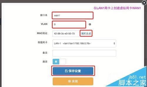 2、添加规则,在lan1接口上创建wan1,VLAN填0(表示基于MAC的VLAN),MAC地址随机生成
