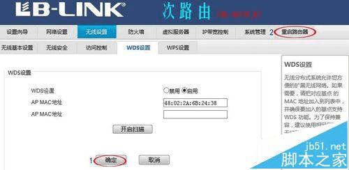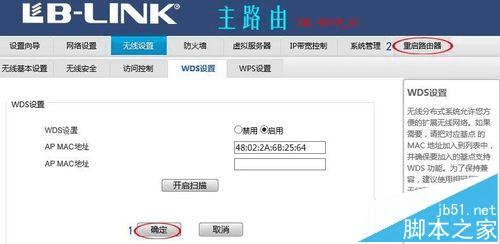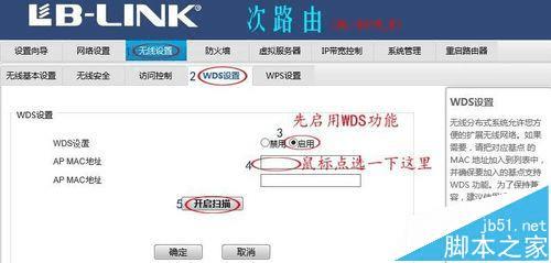 ①、电脑网线连接到次路由的LAN口,并登录到次路由器(BL-841R_B)的WEB管理页面,依次点丫无线设置】-【WDS设置】,先启用WDS功能,点击其中一个连接框,再点击“开启扫描”,最多可连接2个设备。如下图: