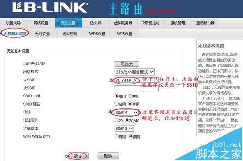 ②、依次点击【无线设置】-【无线基本设置】,在“信道”一项中,改为固定的,比如,4信道;同时便于区分开主、次路由,建议更改一下SSID。如下图: