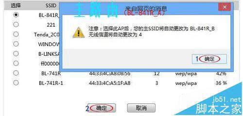 ②、在扫描搜索出的信号列表中,选择要连接的主路由SSID,在弹出的对话框,点击“确定”。如图所示: