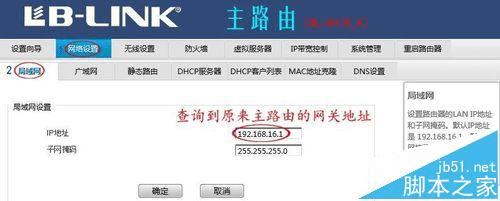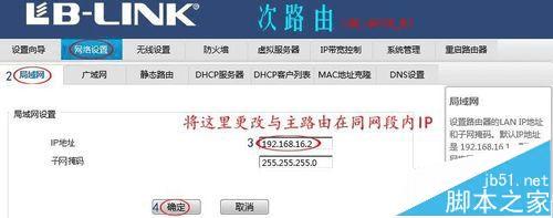 ②、找到【网络设置】-【局域网】,在“IP地址”一栏中,改为与主路由在同网段,比如16.2,如下图所示: