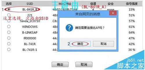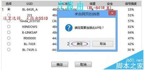 ②、在扫描搜索出的信号列表中,选择要连接的次路由SSID,在弹出的对话框,点击“确定”。如图所示: