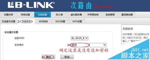 ④、同样,再依次点丫无线设置】-【无线安全】,取消次路由的无线加密,这是便于与主路由WDS设置。如下图: