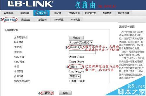 ③、依次点丫无线设置】-【无线基本设置】,将次路由的无线频道,设定与主路由一致,比如:4信道。如下图: