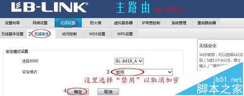 ③、再依次点丫无线设置】-【无线安全】,先取消主路由的无线加密,这是便于与次路由WDS设置。如下图