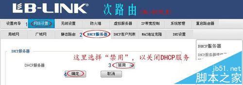 再次登录到次路由(BL-841R_B)的WEB页面,依次点丫网络设置】-【DHCP服务器】,将DHCP禁用。如下图