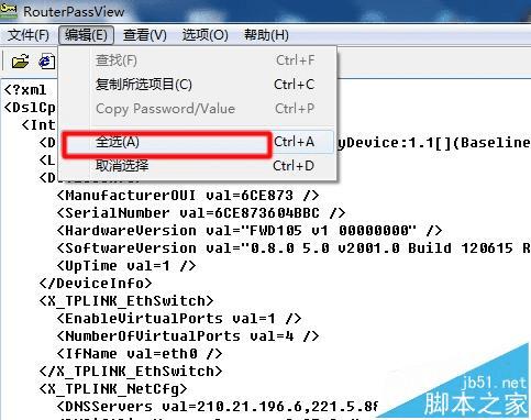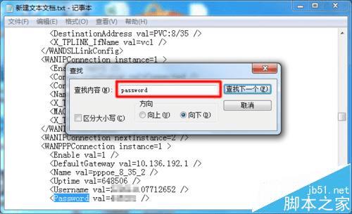 5、按“Ctrl+F键”或点击“编辑”->“查找”,输入“password”查找,很快就能找到pppoe拨号账号和密码的。