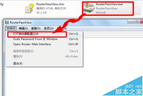 2、打开routerpassview路由器密码查看工具,点击“文件”->“打开路由器配置文件”。