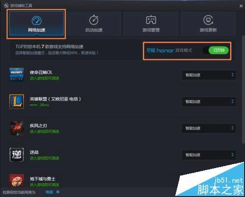2、选择【网络加速】。点击【honor 游戏模式】开启或关闭按钮。