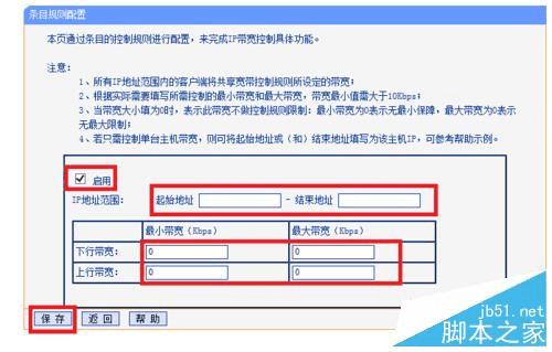 5、若”启用“复选框没选中,首先勾选”启用“复选框,然后,在”IP地址范围“后的文本框中,分别输入”起始地址“和”结束地址“,这里如果你只想对单一的某个IP地址进行控制,只需在”起始地址“文本框中输入步骤3中记录的”IP地址“即可,如果你想对一个连续的IP地址段进行控制,则这两个文本框都需要设置。完成后,对”下行宽带“和”上行宽带“进行设置(注意:这两项的最大值要分别小于步骤4中的”下行总宽带“和”上行总宽带“的值),设置完成后,点击”保存“按钮。